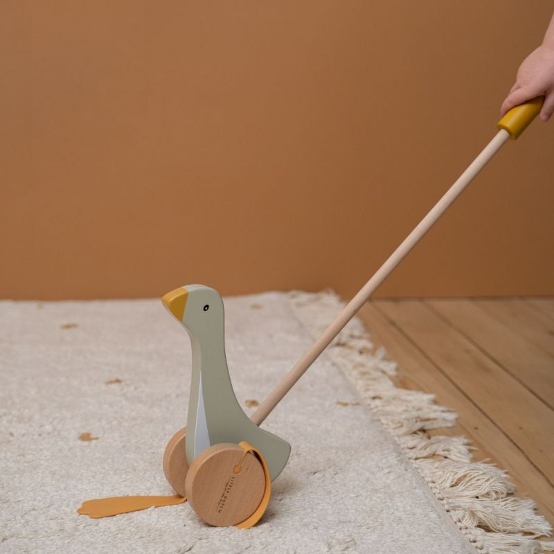 Flap flap flap..questa ochetta sa come fare un ingresso con i suoi piedi svolazzanti. Questo giocattolo a spinta adora esplorare la casa con te e andare all'avventura. Spingila in avanti o tiralo indietro, i suoi piedi buffi e il movimento creeranno ore di divertimento. Incoraggerà il tuo piccolo a camminare e lo aiuterà a sviluppare le capacità motorie di tuo figlio. Realizzato in legno resistente con piedini in gomma, per infinite ore di gioco.