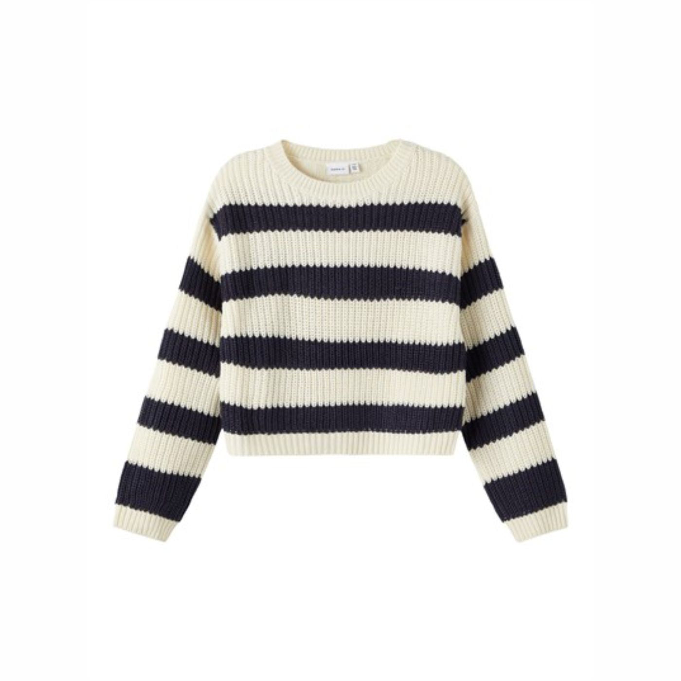 Pullover in maglia a coste con motivo a orizzontali. Corto, con spalle scese.