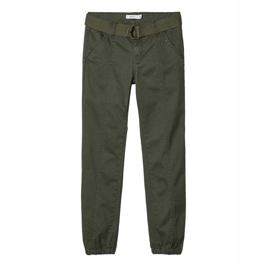 Pantalone cargo con bottone e cintura in vita. Elastico alla caviglia.
