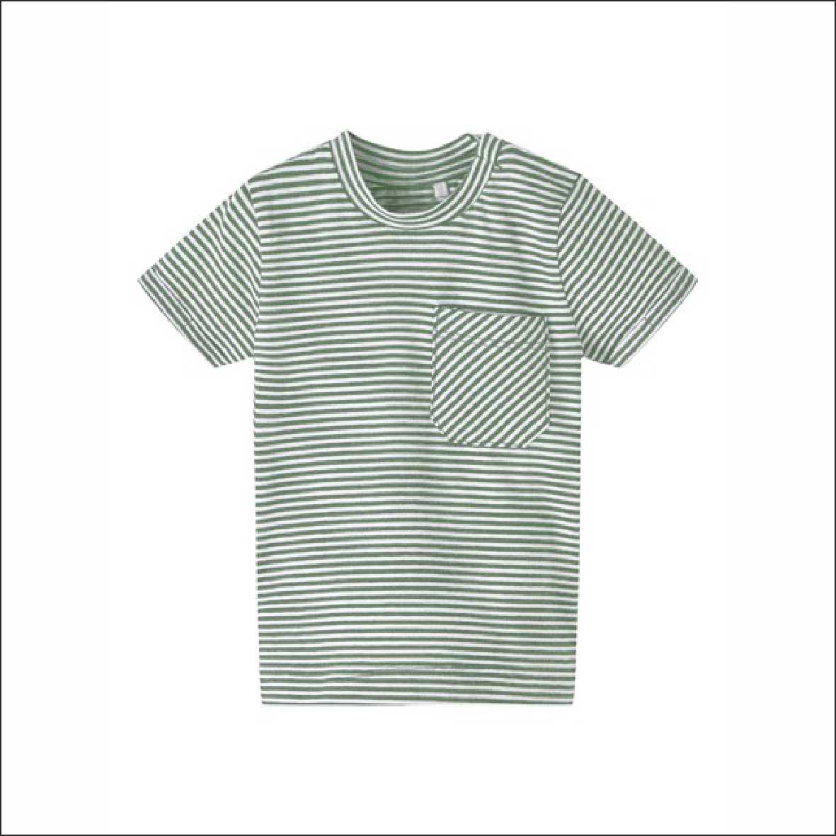 Completino con t-shirt con taschino e shorts con finti bottoni.