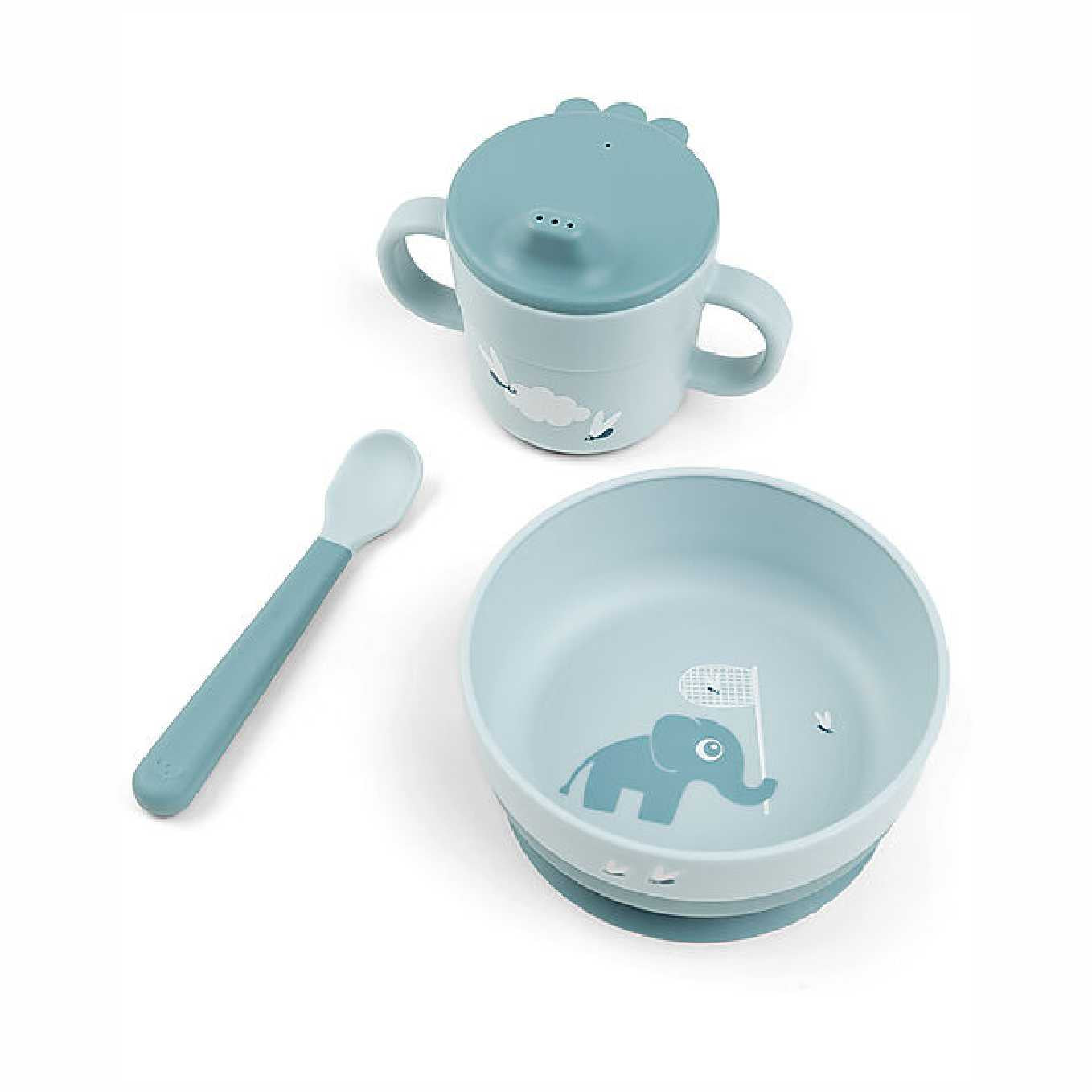 Il pratico starter set in silicone antiscivolo e di facile presa comprende un cucchiaio per bambini, una ciotola e una mini tazza. Stoviglie perfette per neonati e bambini piccoli.